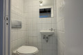 Hell gefliestes WC mit Handwaschbecken, schwebendem WC und Spiegel.