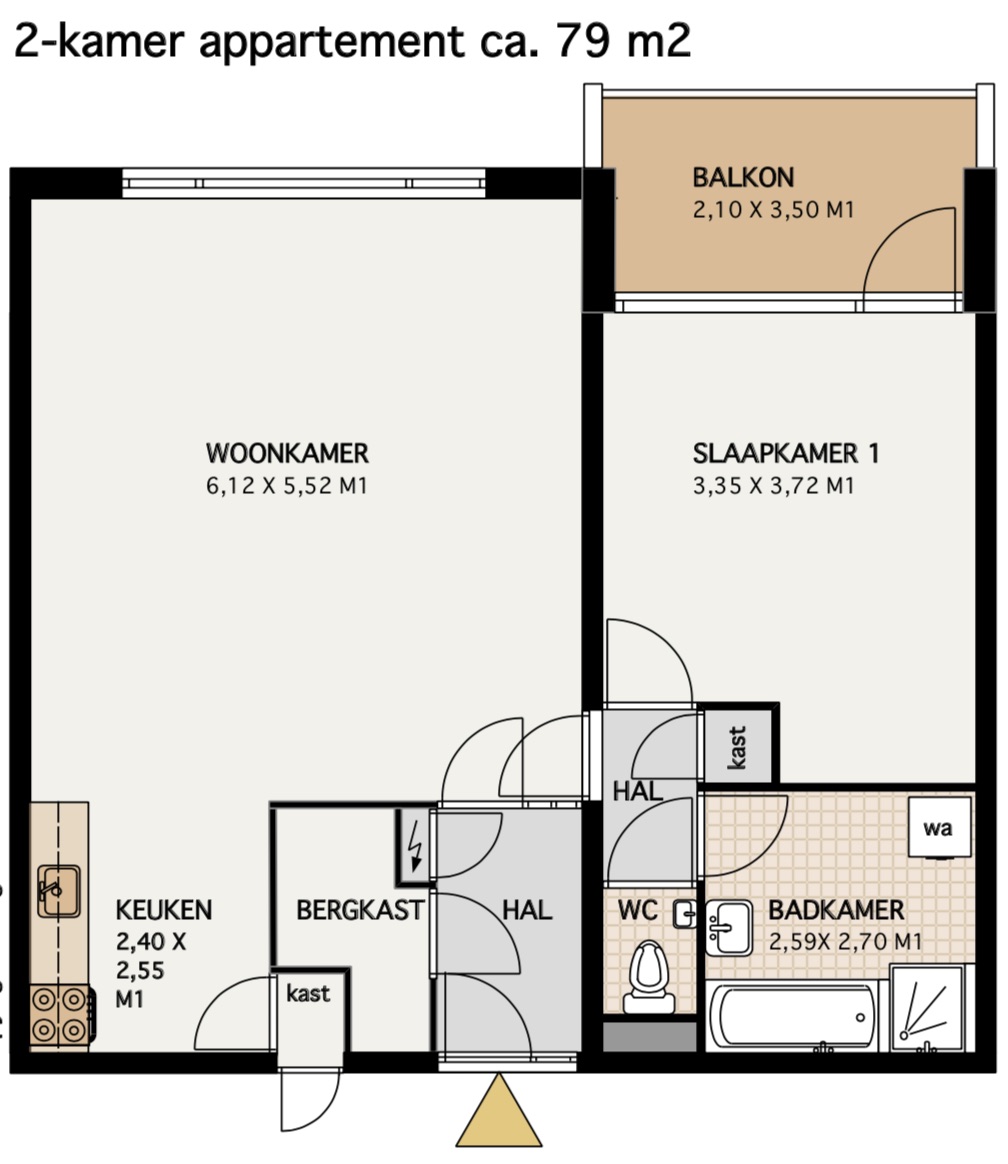 Die Eingangshalle (ca. 9 m²) mit geräumigem Abstellraum und Zählerschrank (mit eigenem Stromzähler) gewährt direkten Zugang zu Wohnzimmer mit Küche, einem geräumigen Schlafzimmer mit Balkon, Badezimmer und separatem WC.