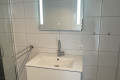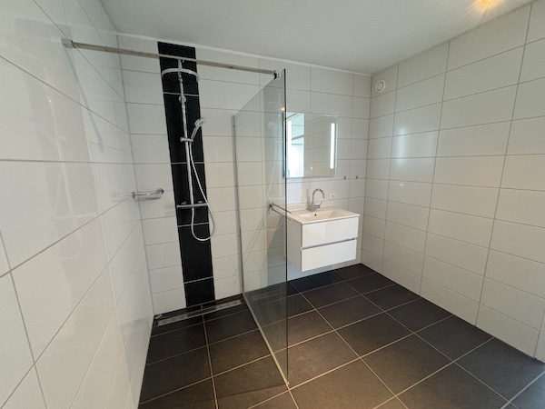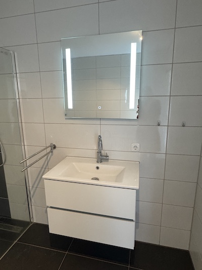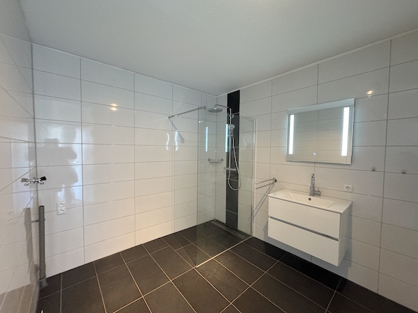Das modernisierte Badezimmer (ca. 7 m²) ist mit ebenerdiger Dusche und Waschtisch mit modernem Spiegel ausgestattet. Hier befindet sich ebenfalls der Waschmaschinenanschluss.