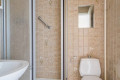 Badezimmer mit Dusche, Waschbecken und Toilette.