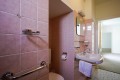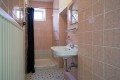 Tageslicht Badezimmer mit Dusche, Waschbecken mit Ablage und Spiegel, Toilette.