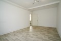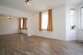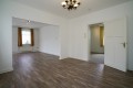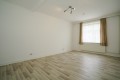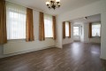 Wohn- und Esszimmer mit Erker, Laminatboden, Wände weiß gestrichen.