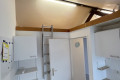 Küche (ca. 9m2) mit Empore und Küchenzeile mit elektrischem Kochfeld (2 Platten), Spüle, Kühlschrank mit Gefrierfach, Ober- und Unterschränke.