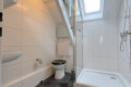 Tageslicht Badezimmer (ca. 4m2) mit Dusche, WC, Handwaschbecken mit Spiegelschrank und Wandheizung. Wände 1/1 weiss und Boden dunkel gefliest.