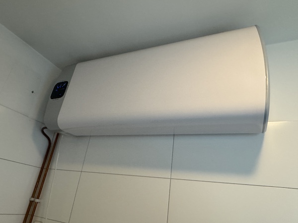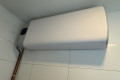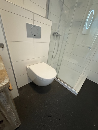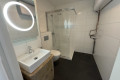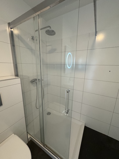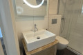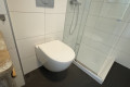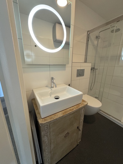 Das moderne Badezimmer (ca. 5,5 m²) ist mit Waschtisch und Unterschrank, Spiegel mit Lichtfunktion, Einlaufdusche mit Regenfunktion und schwebendem WC ausgestattet. Im Badezimmer befindet sich ebenfalls ein Waschmaschinenanschluss und der Warmwasseraufbereiter.