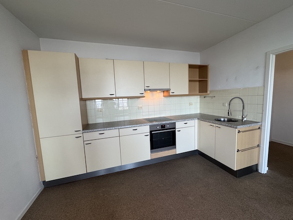 Die Küche zählt zum festen Bestandteil zur Wohneinheit und ist ausgestattet mit elektrischer Kochzone (mit 4 Kochfeldern), Backofen, Dunstabzugshaube, Kühlschrank mit Gefrierfach und Spülbecken. Zudem sorgen Ober- und Unterschränke für genügend Stauraum.